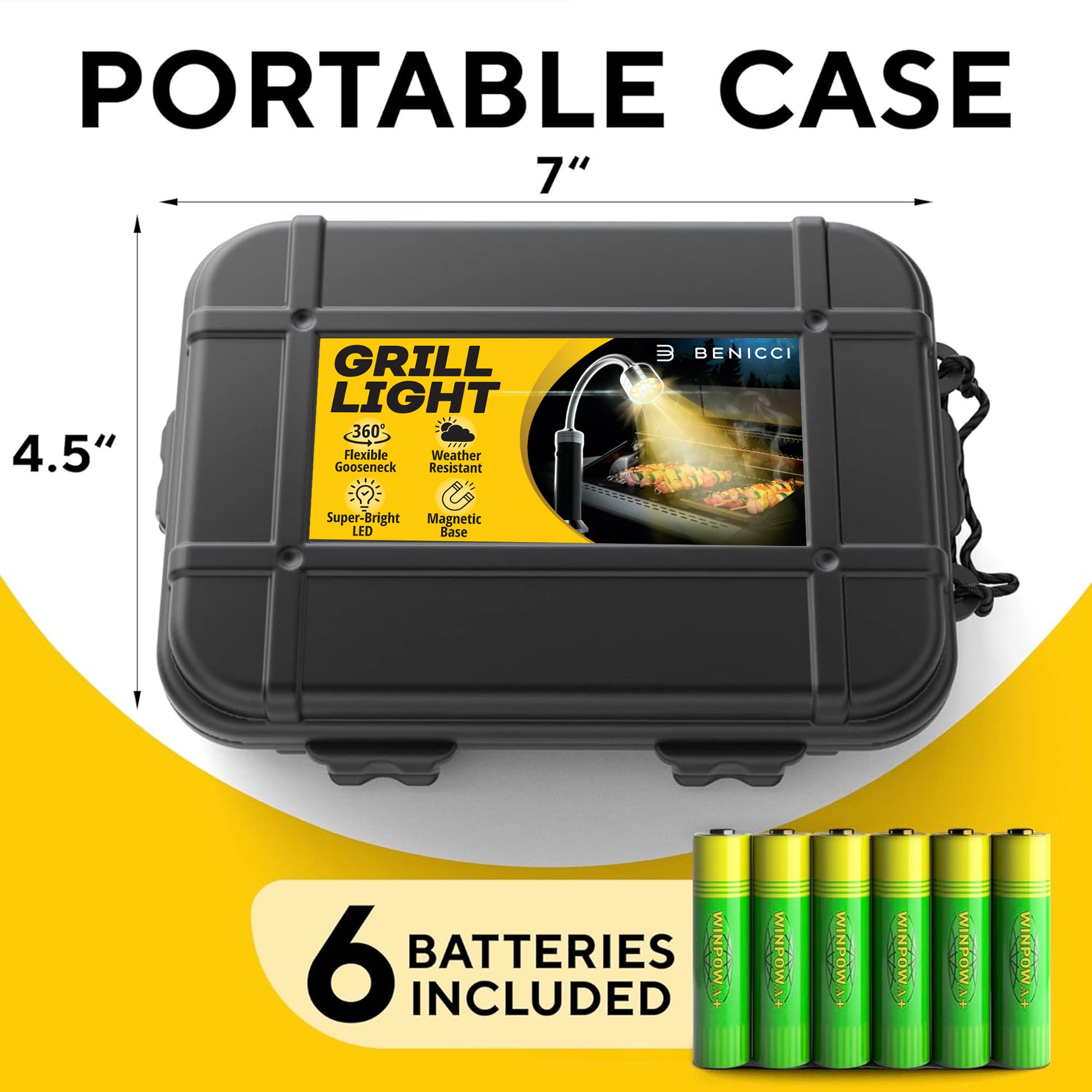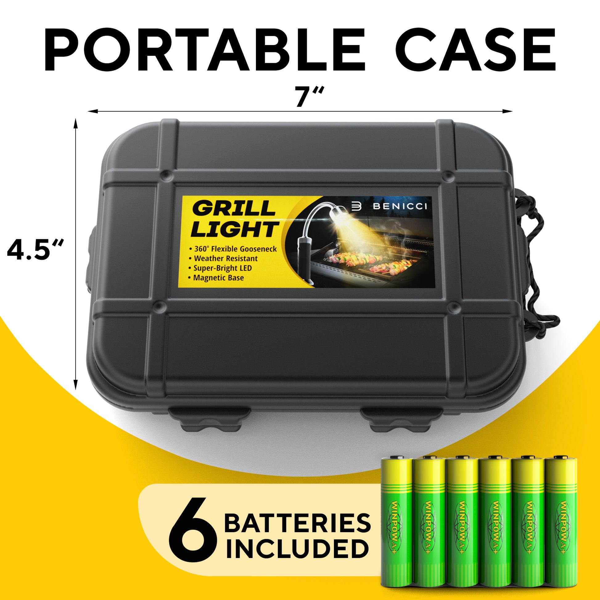- Each purchase includes two BBQ grill lights and 6 AA alkaline batteries, so you can start grilling right away. These lights make an excellent gift for any grilling enthusiast and come with a sturdy protective case for easy transport and storage.