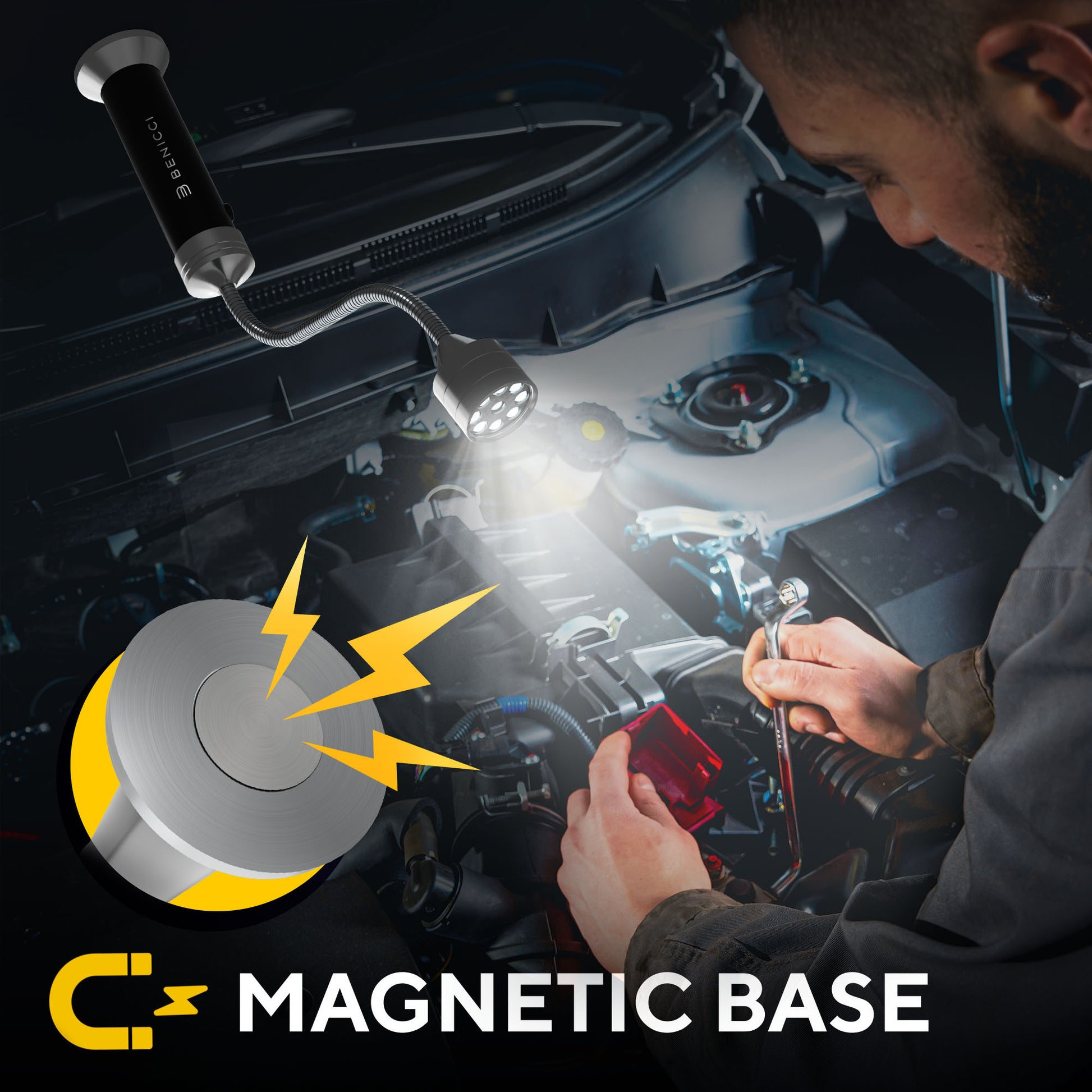 - Our BBQ lights feature 9 high-density LEDs for super-bright illumination. The magnetic grill light base attaches firmly to any grill or metal surface, and the flexible gooseneck allows 360-degree adjustment to focus light where you need it. Made of durable aluminum alloy, these lights withstand high temperatures and are water-safe for any weather.