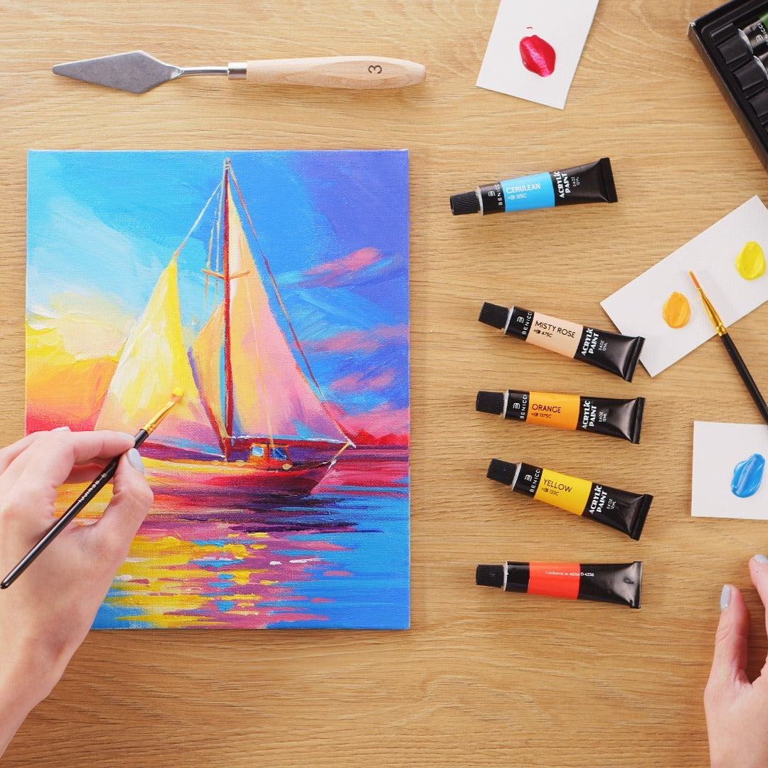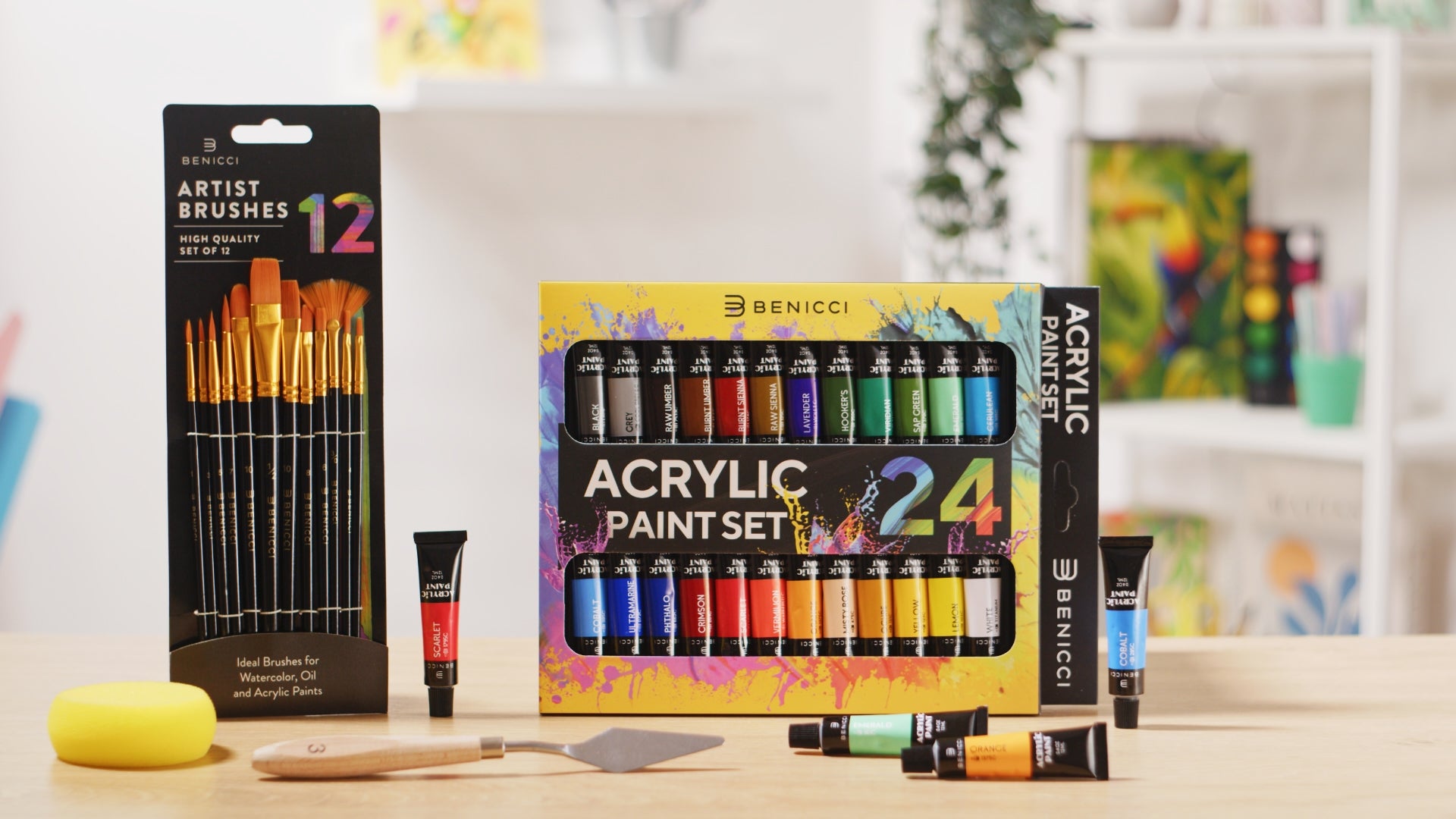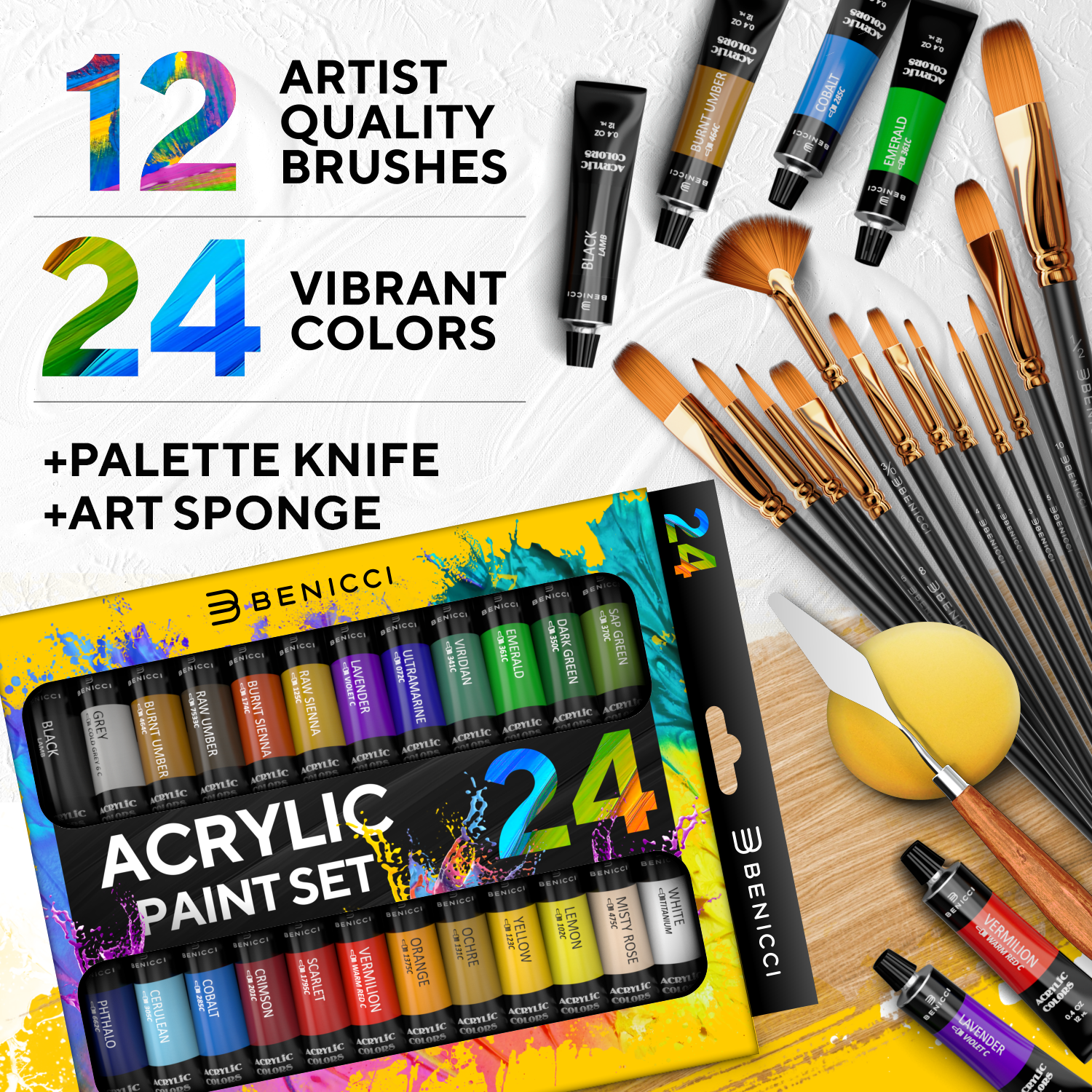 - Complete Acrylic Paint Set - This comprehensive acrylic paint set includes 24 acrylic paints (12 ml each), 12 high-quality brushes, a palette knife, and a sponge ball. Perfect for beginners and experienced artists alike, it's an affordable yet premium choice.
