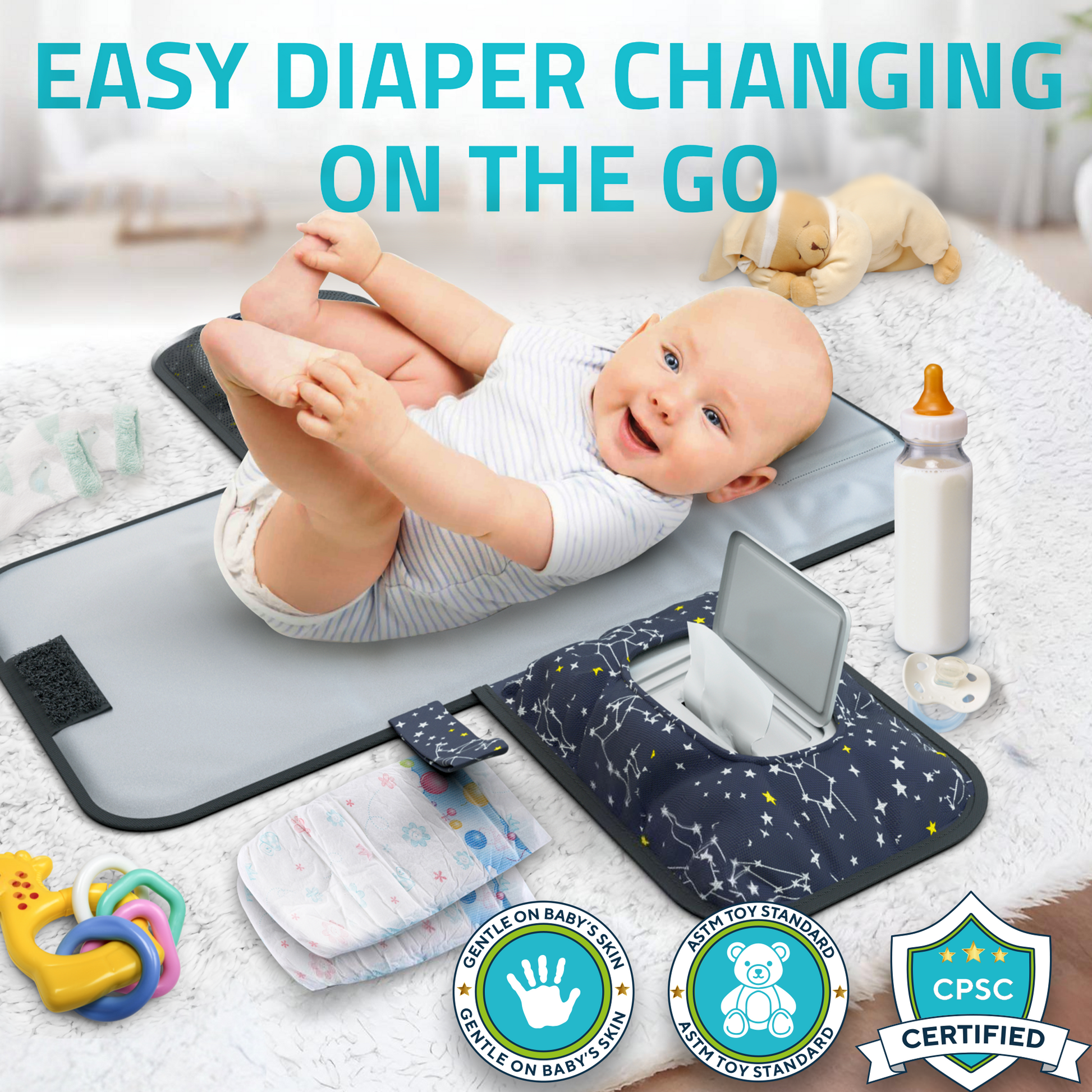 - FITS ALL YOU NEED - Carry all essentials in one baby changing mat. Our unisex portable diaper changing pad has storage for full pack wipes (100 pcs), 5 diapers & additional secure zip pocket for creams, phone, key, and more.